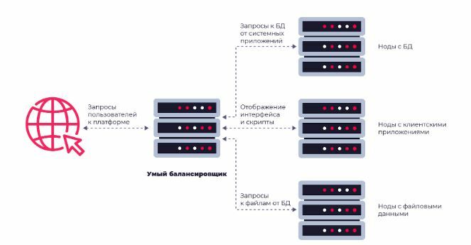 Балансировка нагрузки. “Умный” балансировщик равномерно распределяет запросы между нодами, чтобы они обрабатывались параллельно, см рисунок: