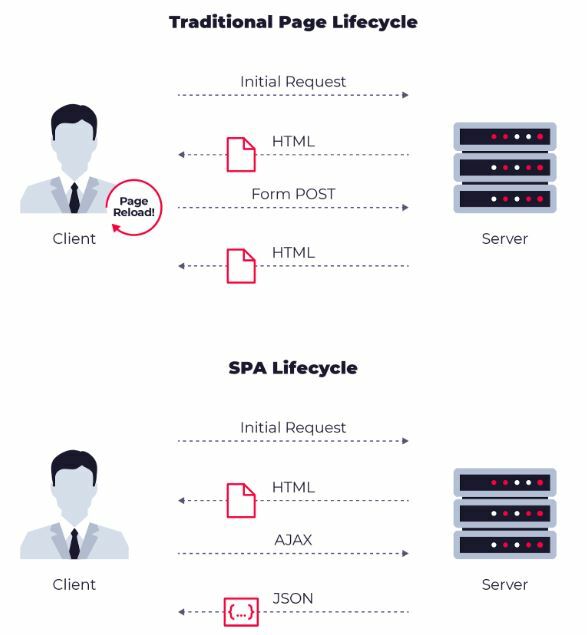 Существует два способа разработки веб-приложений: одностраничные приложения (Single Page Application, SPA) и многостраничные приложения (Multi Page Application, MPA). Одностраничные приложения работают в рамках браузера и не требуют постоянного обновления страницы или загрузки дополнительных страниц во время использования. Например, Google Maps и Facebook являются одностраничными приложениями. Многостраничные приложения имеют более традиционную архитектуру. При каждом запросе пользователя страница полностью перезагружается, обновляются все данные. Скорость и производительность снижаются из-за затрат на отображение одних и тех же элементов. Поэтому для крупных корпоративных систем данный подход не подходит.